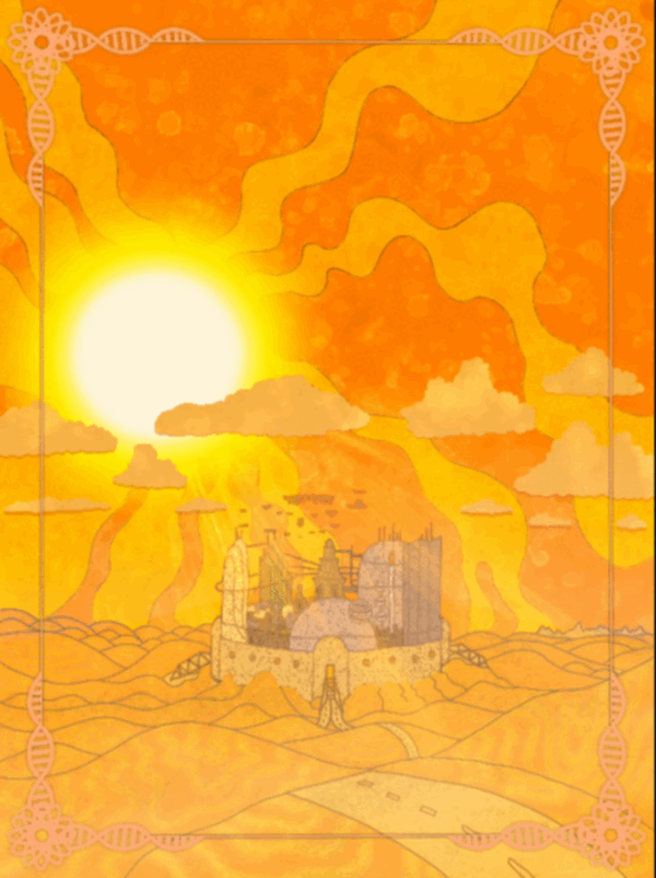 Eugene stared out the window. The dunes rolled by, rising and falling, wave after wave on their journey to the middle of nowhere. Occasionally, they passed a pile of rubble that used to be a home. Other times it was a hollowed out duneduster minus the wheels, engine burned to cinder, the remains plastered in graffiti. There were billboards with running countdowns to the next pump station or nutritional opportunity. Some were stamped with mileage to far-off towns: 150 miles to Lars Canyon, 343 to South Crum. The rest were earnest, heartfelt, hand-painted variations on two related topics: The Commandments and Why You’re Going to Hell.